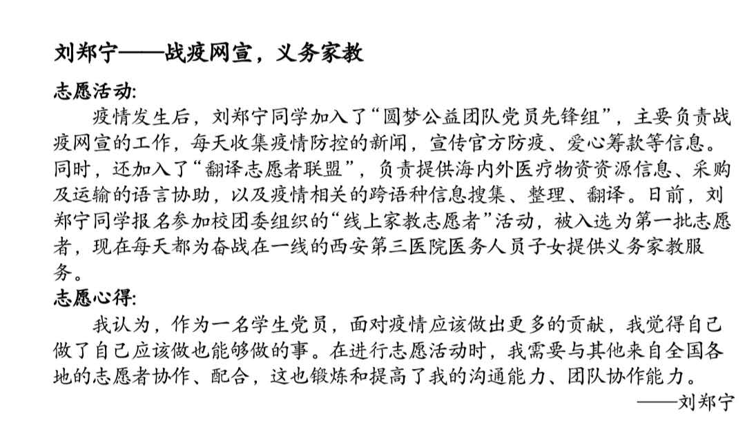 疫情发生以来,我院刘郑宁等多名学生积极参加了由我校团委组织的线上教学志愿服务活动,他们或协助老师进行线上教学,使得天南地北的同学和老师能够顺利汇聚在一起,为停课不停学提供技术保证;或为奋战在一线的西安第三医院医务人员子女提供义务家教服务,以便减轻医护人员的压力,为他们扫除后顾之忧,让他们能够以更好的状态投身抗疫战中。